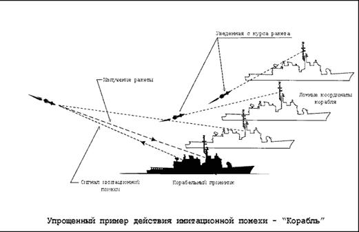 Пример постановки имитационных помех. Передатчик-повторитель (или передатчик имитационных помех), установленный на корабле или самолете, «захватывает» сигналы РЛ ГСН ракеты или РЛС ЗАК. Эти сигналы мгновенно задерживаются и модифицируются перед переизлучением, создавая ложный радиолокационный сигнал. Таким образом, ракета принимает неправильную информацию о цели: дальности, скорости, курсе и, следовательно, ее координатах и наводится на ложный сигнал, что приводит к ее промаху.