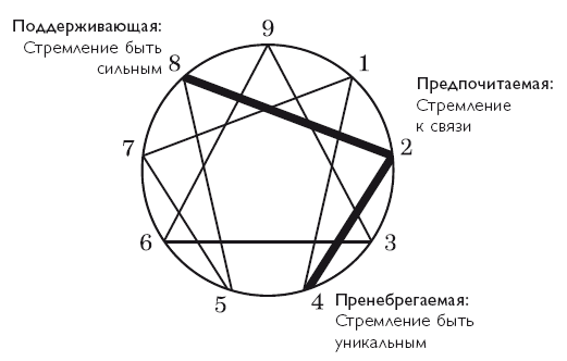 Двойки используют Стремление быть сильными – стратегию, свойственную точке Восемь, – для того, чтобы усилить своё Стремление к связи. Способность Двоек использовать своё влияние для того, чтобы «что-то сделать», гарантирует то, что люди их полюбят, а также помогает другим людям оставаться связанными с ними. Они защищают и неустанно борются за права людей, которые им важны. Однако в стрессе они могут также стать агрессивными, доминировать или манипулировать, вести себя так, чтобы заставить людей сделать выбор – решить, любят ли они их или ненавидят. Они могут вести себя напыщенно и заставлять (в том числе с помощью запугивания) людей сделать так, как необходимо Двойке. Двойки также порой используют свою агрессивность для того, чтобы изменения, которых Двойки не хотят, не произошли.