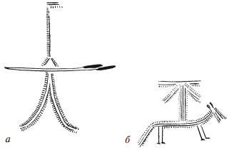Рис. 21.Гравировка на лицевых урнах: а –фигура человека с двумя копьями; б –фигура всадника