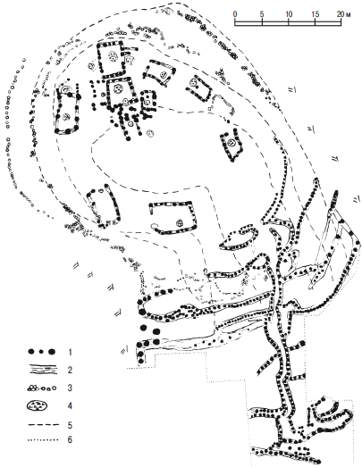Рис. 23.План укрепленной деревни. Старжиково Мале, Северная Польша (древняя Пруссия): 1 –ямы из-под деревянных столбов в стенах домов и ограды; 2 –стены и рвы; 3 –камни; 4 –очаги; 5 –линии высот; 6 –границы раскопов