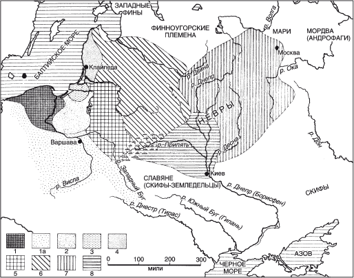 Рис. 24.Группы балтов раннего железного века: 1 –культура лицевых урн, Померания и низовья Вислы; 1а –зона проникновения культуры колоколобидных могил, IV и V вв. до н. э.; 2 –западномазурская группа (возможно, прусские галиндяне); 3 –зембско-нотангская группа; 4 –нижненеманская и западно-латвийская группа (древние курши); 5 –восточномазурская группа судовян (ятвягов); 6 –группа носителей культуры гребенчатой керамики, заместившей литовцев, селя, латгалов и земгалов; 7– культура гладкой керамики восточных балтов; 8 –милоградская группа (VII–VI вв. до н. э.)