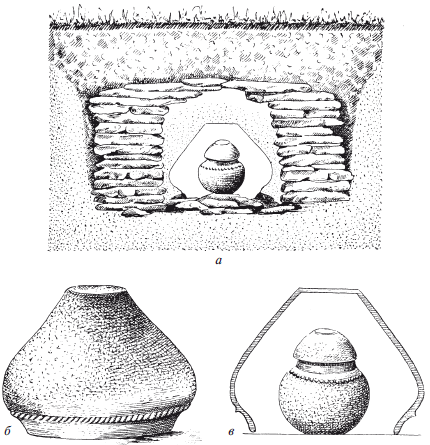 Рис. 25.Прикрытая горшком могила с урной из Восточной Померании: а –общий вид; б –горшок, покрывавший урну; в –урна