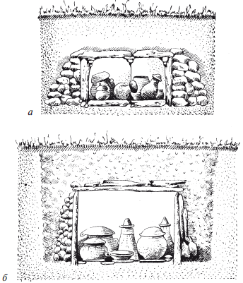 Рис. 26.Погребальные урны в каменных («семейных») гробницах: а –из Силезии; б –из Восточной Померании число погребений с покрытыми урнами в южной и центральной частях Польши постепенно сокращается, и в I веке до н. э. они исчезают полностью.