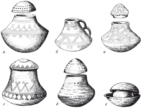 Рис. 28.Прусские погребальные урны: а – г –геометрический орнамент; д –урна с «глазами»; е –урна с костями птиц, покрытая блюдами