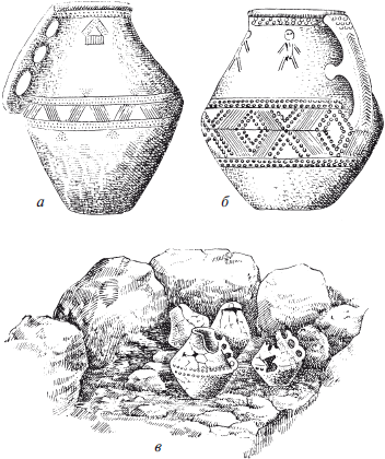 Рис. 29.Погребальные урны из Земланда ( а, б) и семейная гробница с урнами ( в)