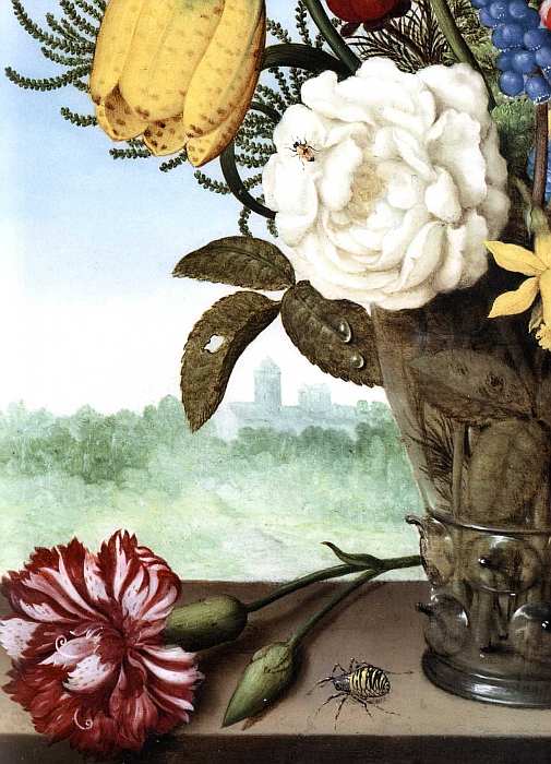 Данная картина является одним из украшений коллекции Лос-Анджелесского окружного музея искусств. На мраморном подоконнике в высоком стеклянном стакане стоит роскошный букет, составленный из различных сортов цветов. На нежные лепестки живописец «посадил» мушку, стрекозу, бабочку, а около сосуда – паука, что придает произведению особую символистическую интонацию, напоминая зрителю о бренности мира. Фоном служит подернутый легкой дымкой пейзаж, большую часть которого занимает небо. Стоит отметить, что мастер написал всего четыре цветочных натюрморта с букетом на подоконнике на фоне неба.