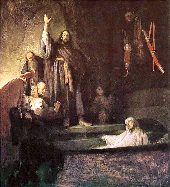 Стоит отметить, что на протяжении жизни мастер неоднократно возвращался к сюжету «Воскрешение Лазаря», разрабатывая его не только в живописи, но и в графике. На данной картине художник изобразил Христа и родственников умершего, среди которых находятся его сестры Мария и Марфа, внутри пещеры, где погребен Лазарь. Иисус, стоя на возвышении и высоко подняв руку, «воззвал громким голосом: Лазарь! Иди вон» (Ин. 11:43). По зову Господа Лазарь восстает из могилы (напомним, что к моменту прихода Христа он был мертв четыре дня). Рембрандт показывает реакцию каждого из присутствующих на творимое Сыном Божьим чудо.