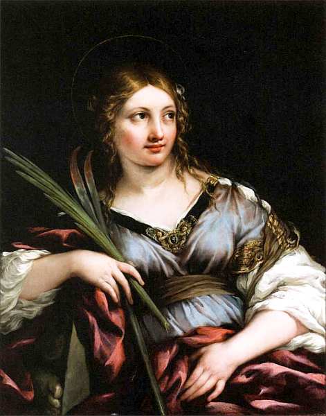 На полотне «Святая Мартина» изображена римлянка, принявшая смерть около 226 за непогрешимую веру во Христа. Молодая девушка показана на темном нейтральном фоне. Ее взгляд отведен в сторону, святая словно смотрит на скрытого от глаз зрителя собеседника. В правой руке она держит пальмовую ветвь, являющуюся традиционным символом мученичества, и раздвоенный крюк – предмет своей пытки. Перед тем как Мартину обезглавили, ее подвергли пыткам и повесили на крюк. Отметим, что святая опирается на фрагмент языческой статуи, которой она отказалась поклоняться. Колорит произведения строится на сочетании всего нескольких сложных оттенков (синего, красного, черного) и дополняется звучными нюансами белого и золотистой охры.