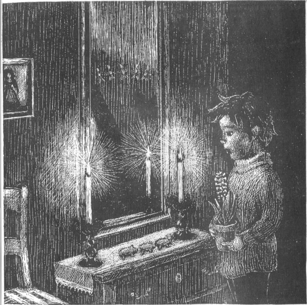 – Пусть в прихожей горят свечи, – говорит мама, – тогда уж ты не будешь тревожиться за цветок. Поставь его назад!