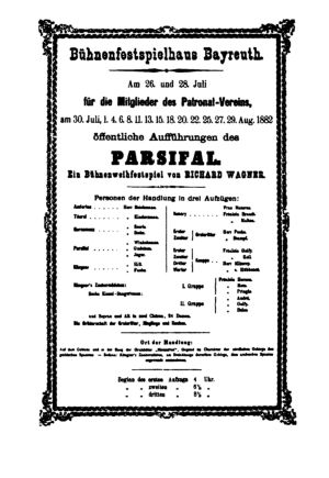 На афише «Парсифаля» указано, что первые два представления оперы, 26 и 28 июля, даются только для членов «патронатных обществ». 1882 г.