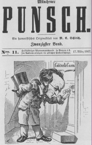 Вагнер в очередной раз пришел за деньгами баварской казны. Карикатура мюнхенской газеты «Пунш». 17 марта 1867 г.