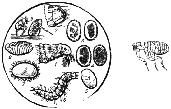 1 – голова, 2 – задний конец тела, 3 – свежеотложенное яйцо, 4 – начало формирования личинки в яйце, 5 – яйцо перед вылуплением личинки, 6 – личинка, 7–8 – куколка, 9 – блохи, сосущие кровь