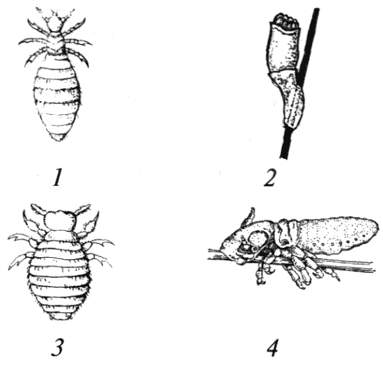 1 – вошь, 2 – яйцо вши (гнида), 3–4 – власоед