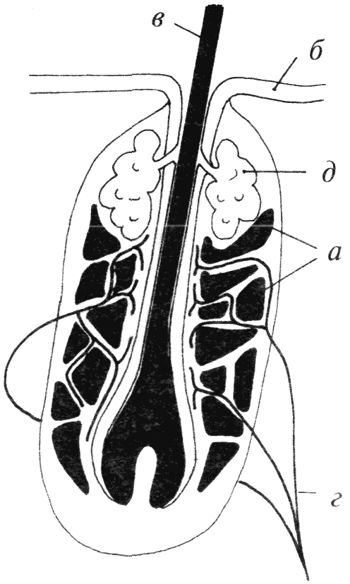 а – венозные синусы; б – эпидермис; в – вибрисса; г – нервные окончания; д – кожные железы