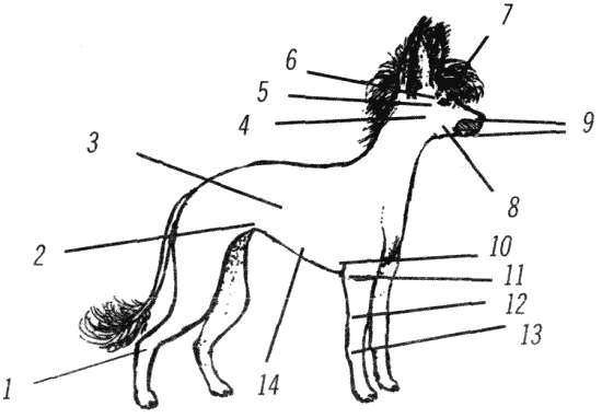 1 – пяточные, 2 – паховые, 3 – боковые, 4 – щечные, 5 – заглазничные, 6 – надглазничные, 7 – вибриссы-брови, 8 – угловые, 9 – околоротовые, 10 – грудные, 11 – локтевые, 12 – предплечные, 13 – запястные, 14 – брюшные