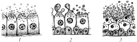 2. Апокриновые клетки при выведении секреторного продукта отделяют апикальную часть цитоплазмы, содержащую секреторный материал вместе с плазмолеммой. Клетка сохраняет целостность плазматической мембраны и продолжает функционировать. Апокриновым способом, например, осуществляется секреция липидов клетками молочной железы. Липиды собираются в крупные капли, которые направляются к апикальной поверхности клетки. Окруженная тонким слоем цитоплазмы и плазмолеммой, такая липидная капля выступает в просвет секреторного отдела и затем отшнуровывается от поверхности клетки. Этот секреторный механизм также характерен для клеток апокриновых потовых желез.