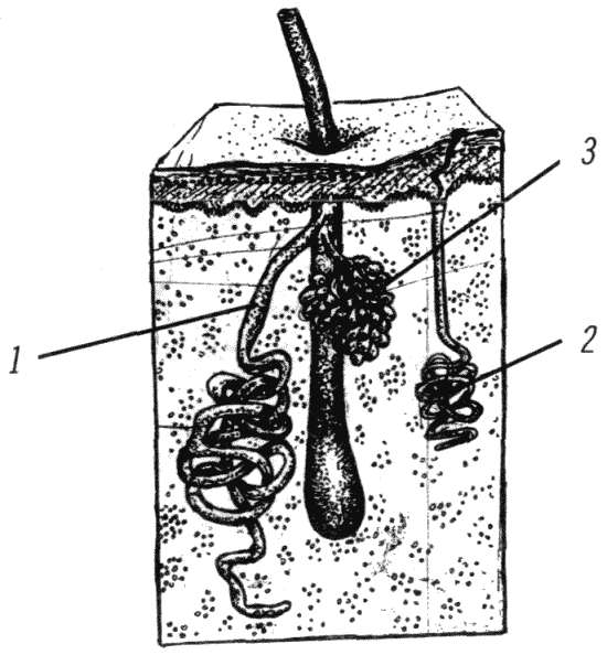 1 – апокриновая железа, 2 – эккриновая железа, 3 – сальная железа