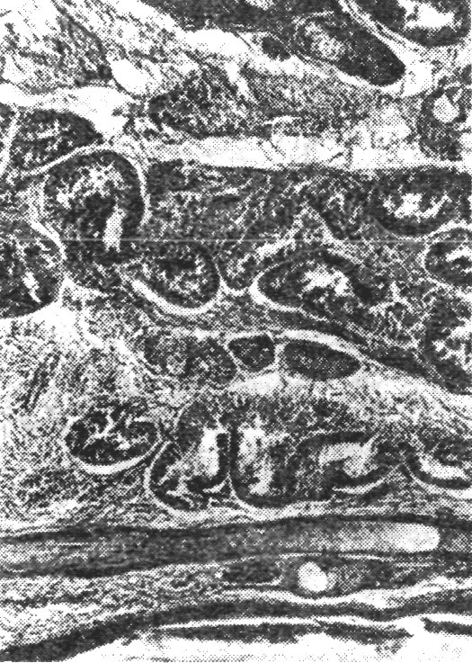 Альвеолярные, т. е. мешковидные, функционирующие по голокриновому типу сальные железы встречаются на фолликулах первичных и вторичных волос во всех областях тела. При секреции этого типа эпителиальные клетки железы претерпевают жировое перерождение, в их цитоплазме накапливается все больше жировых капель. В конце концов, клетки разрушаются и образуют сальный секрет, который скапливается в полости железы. Сальные железы возникают в период внутриутробного развития вместе с формированием корней волос, однако полностью завершают свое развитие только с наступлением половой зрелости. Размеры и форма сальных желез варьируют в зависимости от вида животного, породы, области тела и типа волосяного фолликула. Особенно крупные и дольчатые железы находятся на спинной стороне шеи, на спине и на хвосте, более мелкие и простые – на животе. Все сальные железы, относящиеся к одной группе волос, расположены примерно на одном уровне, в сетчатом слое дермы.