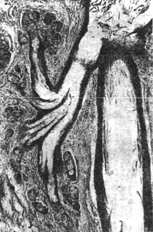 Каждый активный волосяной фолликул покрыт мелкоячеистой капиллярной сетью.