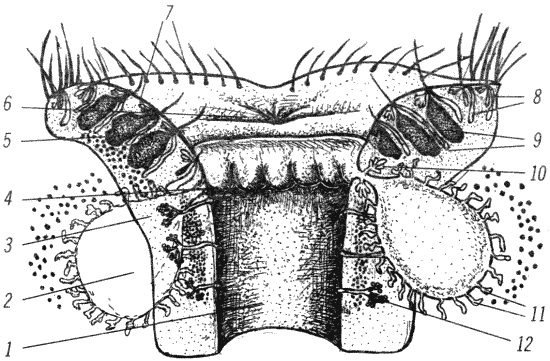 1 – прямая кишка, 2 – анальная сумка, 3 – наружный сфинктер, 4 – наружная кожная зона ануса, 5 – внутренняя кожная зона ануса, 6 – вход в прямую кишку, 7 – волосяные луковицы, 8 – потовые и сальные железы, 9 – циркуманальные железы, 10 – сальные железы протока анальной сумки, 11 – потовые железы, 12 – проктодеальные железы