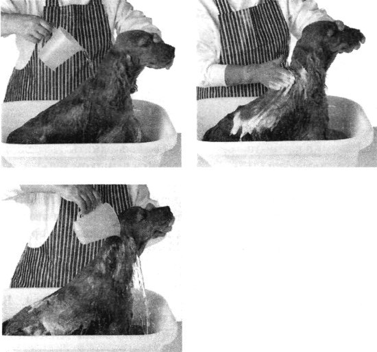 Шампунь предварительно разводят теплой водой в таком соотношении, чтобы образовалась хорошо мылящаяся суспензия. Разведенный шампунь наносят на хорошо смоченную шерсть и бережно намыливают до образования обильной пены. Для этой цели можно использовать губку, предварительно налив на нее шампунь. Сильно загрязненные места приходится намыливать дважды. В последнюю очередь намыливают голову и уши. Затем собаку необходимо тщательно ополоснуть проточной водой, иначе остатки мыла на коже могут вызвать сильный зуд. После этого на мокрую чистую шерсть наносят бальзам-ополаскиватель (кондиционер). Его также удобно использовать в разведенном виде. Если шампунь, которым вы мыли собаку, уже содержал в себе кондиционер, можно обойтись без него. Через некоторое время, которое указанно на флаконе с кондиционером, собаку нужно снова тщательно ополоснуть чистой водой. Теперь дайте ей отряхнуться. Некоторые собаки умеют это делать по команде. Затем нужно бережно отжать руками длинную шерсть и вынуть собаку из ванны, завернув в большое полотенце. Вытирать ее не следует. Короткошерстным собакам для удаления с шерсти остатков воды вполне достаточно отряхивания. Во время мытья проверьте, в каком состоянии находятся околоанальные железы, и при необходимости очистите их от содержимого.