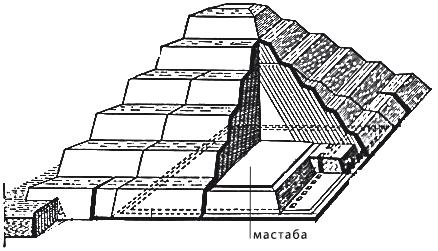 Первоначально захоронения знати производились в гробницах, состоящих из подземной части, где стоял саркофаг с мумией, и массивной надземной постройки – мастаба (по-арабски – скамья) – в виде дома, стены которого были наклонены внутрь, а сверху завершались плоской крышей.