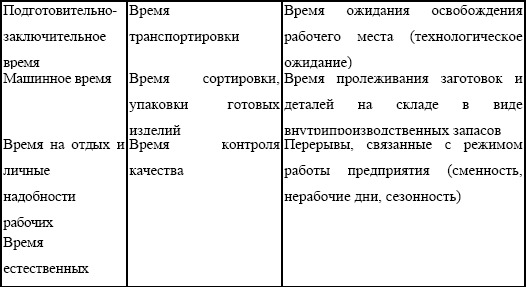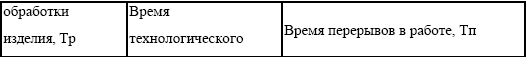 Продолжительность производственного цикла во времени (Тц), как видно из таблицы, включает 3 стадии: время технологической обработки изделия (рабочий период, Тр), время технологического обслуживания производства (Т0) и время перерывов в работе (Тн).