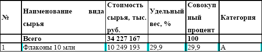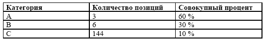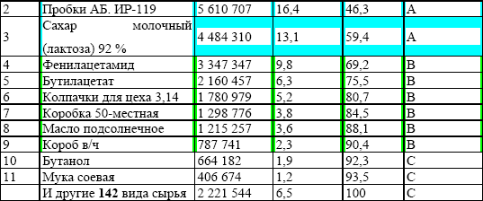 2) группа В – 6 наименований, стоимость которых составляет около 30 %;3) группа С – все остальные 144 вида сырья, удельный вес которого в затратах на сырье и материалы меньше 10 %.