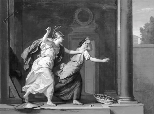 Взглянув сердито на старушку, она вдруг увидала, как та в одно мгновение обернулось высокой, прекрасной, величественной сероокой девой с золотыми кудрями, увенчанными золотым шлемом. То была сама Афина.