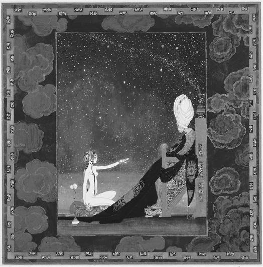 Иллюстрация датского художника Кея Нильсена к рамочному повествованию «Тысячи и одной ночи» напоминает нам о том, что, несмотря на всю свою героическую стойкость, Шахразада – фигура маленькая и слабая. Она сидит, обнаженная, у ног царя, беззащитная перед ним и в буквальном, и в метафорическом смысле: ей не скрыться ни от его взгляда, ни от его царской власти. Шахрияр же приобретает у Нильсена сверхчеловеческие размеры за счет огромного тюрбана и стелющегося по полу одеяния – и мы понимаем: хотя он и поддался очарованию сказок Шахразады, лишь от его воли зависит, какой будет дальнейшая судьба хрупкой сказительницы. Сама же Шахразада здесь больше походит на Гестию, богиню домашнего очага, чем на Афину или Афродиту. И, анализируя эту визуальную взаимосвязь между царем и Шахразадой в интерпретации Нильсена, сложно усомниться в том, что Шахразада представлена здесь как фигура подчиненная и «домашняя»{114}114