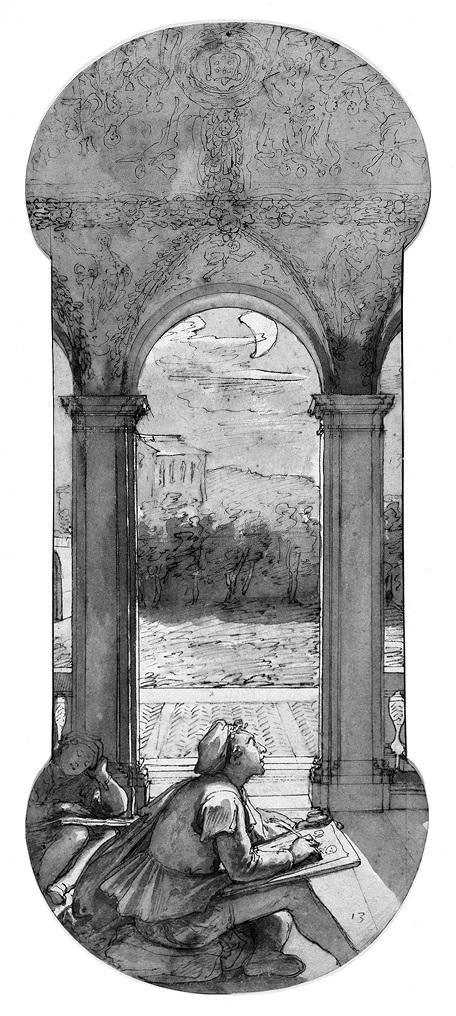В цикле встречаются изображения фресок великих современников, привлекших внимание Таддео. Один рисунок посвящен росписям Рафаэля в лоджии Психеи на вилле Фарнезина (ил. 3). Самое любопытное, что юноша представлен разглядывающим и зарисовывающим фрески при свете луны. Это соответствует рассказу Вазари о том, как Таддео, за неимением жилья, не раз ночевал возле «Амура и Психеи»[66]66