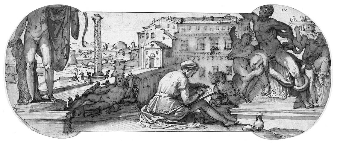 Ил. 7. Федерико Цуккаро. Таддео зарисовывает Лаоокон. Около 1595. Перо, кисть коричневыми чернилами, следы черного мела и сангины. Музей Пола Гетти, Лос-Анджелес. Inv. 99.GA.6.17.