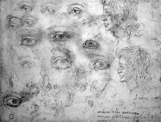 Один из сохранившихся листов был предназначен для упражнений в рисовании глаз (1524–1525). Образцы Микеланджело помещены в верхней части, а под ними – копии учеников[281]281