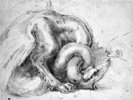 В любом случае другие совместные упражнения мастера и ученика доказывают, что Микеланджело не проявлял никакого интереса к развитию способностей Мини. Вместо этого он давал ему задания копировать свои рисунки, а затем подшучивал над результатом с помощью различных карикатур. Возле фигуры жирафа на эскизе из Оксфорда (оборотная сторона рисунка «Геркулес и Антей», 1525–1528) Микеланджело поместил существо, напоминающее динозавра, пародирующее неуклюжую манеру горе-ученика[280]280