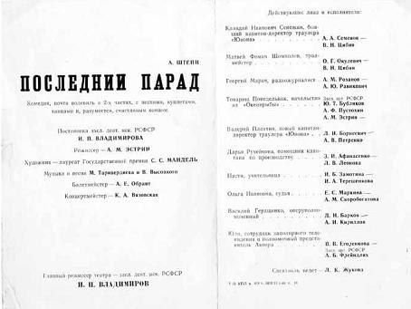 "19 мая (1968 год. – М.Ц.). «Сатира» начала репетиции «Последнего парада». Завтра начинает Владимиров в Ленинграде". (Владимиров был главным режиссёром Театра им. Ленсовета – М.Ц.)