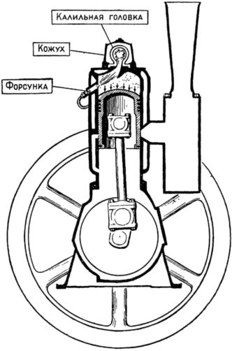Только в цилиндр засасывалась не рабочая смесь газа или пара с воздухом, а один воздух. Верхняя часть цилиндра сообщалась с большим полым шаром, который назывался «калоризатором» или запальным шаром, или калильной головкой. Этот шар перед пуском двигателя разогревали паяльной лампой докрасна. Против шара в верхней части цилиндра помещалось специальное устройство, через которое можно было впрыскивать нефть (или керосин). Такие устройства называются «форсунками».