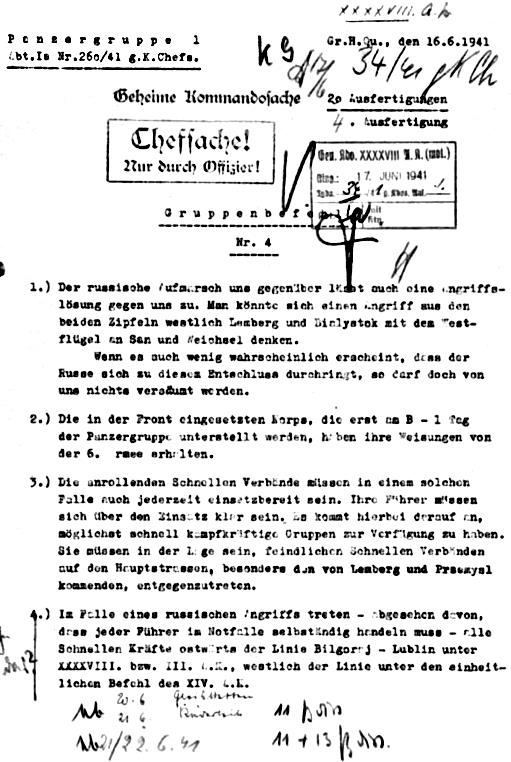 Примечательно, что если во множестве других документов открывать огонь по советским самолетам разрешается лишь в том случае, «когда однозначно видно их намерение атаковать бортовым оружием или бомбами», то в приказе по 1-й ТГр от 16 июня разрешено «открывать огонь по всем однозначно опознанным самолетам противника в 5 км к западу от границы».