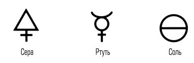 В рамках алхимии все видимое можно разделить на три базовые составляющие: Соль (тело), Сера (сознание или душа) и Ртуть (жизненная сила) (см. рис. 10). Равно как при работе с минералами на разных этапах создания белого и красного камней используется реальная минеральная сера и ртуть, в растениях и животных принято выделять свои собственные эквиваленты серы, ртути и соли. Если говорить про растения, то его физическое тело является Солью, спирт, который образуется при разложении тела, – Ртуть, а все содержащиеся в растении жиры, масла и другие отличительные химические характеристики – это Сера. Что касается людей или животных, физическое тело является Солью, кровь – Ртутью, а сознание или самовосприятие – Серой. Сера, Ртуть и Соль вместе взятые рассматриваются как три базовых элемента. Только путем астральной проекции и образования Тела Света мы можем безопасно работать с человеческим телом как формой алхимии, так как все действия в этом учении требуют «умерщвления» (или, как в данном случае, состояния глубокой релаксации и сна) физического тела.