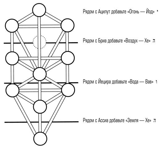 По мере развития единства и установления уровней энергии – материи – сознания, которые мы называем Древом Жизни, также создаются различные отражения Древа Жизни, и каждое из них имеет собственное уникальное выражение этой энергии. Первое Древо, если его можно так назвать, это в основном энергия и немного разума, практически нет ни формы, ни материи (по крайней мере в нашем понимании). Это Древо Ацилут, духовный мир, который благодаря своей энергетической природе часто ассоциируется с Огнем, или буквой Йод в Тетраграмматоне (четырехбуквенном имени Господа).