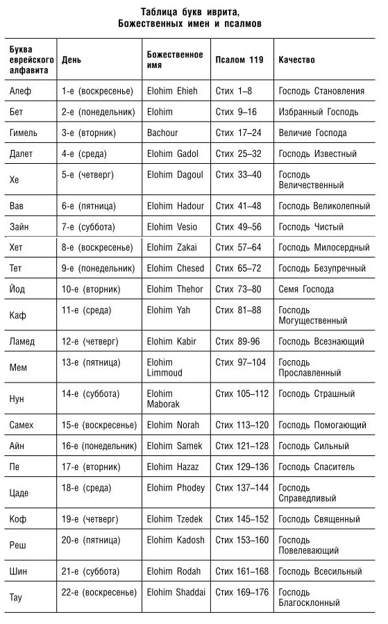 В данном ритуале используется псалом 119, который можно читать по-английски, на иврите или на латыни, он самый длинный, и в нем содержатся определенные ссылки на все буквы еврейского алфавита. Предпочтительнее использовать версию на иврите, но исторически сложилось так, что этот ритуал проводился на латыни. Если вы не умеете читать на иврите и не хотите использовать латынь, то можно произносить псалом по-английски. Этот псалом задает атмосферу и связывает нас с традициями. Медитация на букву и интонации при произнесении Божественного имени пробуждают внутри нас энергию и поэтому являются очень важными. Однако нумерация псалмов не универсальна. Использующие версию на иврите заметят, что номер псалма – 119, как и в переводе на английский Короля Якова, но в латинском и католическом переводе номер псалма становится 118. Поскольку большинство будут производить данный ритуал по-английски, то данное расхождение не представляет проблемы. Желающим читать псалом в оригинале на иврите или занимающимся поиском достоверного перевода на английский язык мы советуем использовать Танах на иврите и английском языке, опубликованный Еврейским издательским обществом.