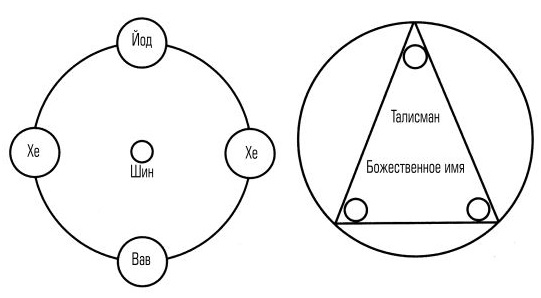 Для ритуала необходимо несколько инструментов, которые легко приобрести или сделать. Вам потребуется простая ритуальная ткань, желательно белого или беловатого оттенка, которая ранее не использовалась в других целях. Можно также нарисовать диаграммы на куске фанеры, если он ранее не использовался. Ритуальный ковер, как его иногда называют, состоит из одного большого круга диаметром примерно от трех до четырех футов{2}, а также четырех заходящих друг на друга кругов с каждой из четырех сторон ковра. На каждой стороне ковра нужно нарисовать или написать по одной букве еврейского алфавита из Божественного имени Господа, или Тетраграмматона. Ритуальный восток должен располагаться перед вашим лицом при выполнении ритуала, и на этой стороне ковра должна быть написана буква Йод. Справа, на ритуальном юге, должна быть буква Хе. Сзади, на западе, должна быть буква Вав, а слева, на севере, – буква Хе. Это верховное имя Господа в иудаизме и каббале. Согласно многим группам посвящения, оно также известно как утраченное слово, поскольку его правильное произношение было потеряно за многие годы. Восстановление его правильного произношения – задача мага, алхимика, каббалиста, и при этом они возрождают собственную внутреннюю гармонию. В центре большого круга находится буква еврейского алфавита Шин, означающая «Святой Дух» или «Божественное Присутствие», также известное как Шхина. Вместе с остальными четырьмя буквами Шин создает Божественное имя YHShVH или Yodheshuah, важное имя в христианском мистицизме, а также в работах Ордена Золотой Зари, в частности, в ритуале Розы и Креста. Небольшая свеча должна стоять в подсвечнике на букве Шин или немного выше нее (см. рис. 8).