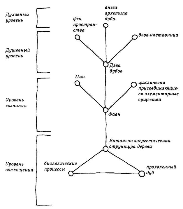 [Закрыть] коренится в том, что он распространяет свое внимание одновременно не меньше, чем в пяти различных направлениях. С одной стороны, он общается с дэва дуба (II), которая в функции групповой души сохраняет для всех дубов в своей зоне праобраз соответствующей породы. Кроме того, он связан с паном (III) ландшафта, как своим наставником и духовным руководителем.