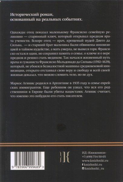 Однажды отец показал маленькому Франсиско семейную реликвию – старинный ключ, который открывал предкам врата учености. Вскоре отец – врач, крещеный иудей Диего да Сильва, – и старший брат мальчика были обвинены инквизицией в тайном иудействе, а мать умерла, не вынеся горя. Франсиско остался один, но сохранил память о семье, о ключе и о вере предков и решил стать медиком. Так начался жизненный путь врача и гуманиста Франсиско Мальдонадо да Сильвы (1592–1639), который, не убоялся безжалостной машины средневековой инквизиции, открыто отстаивал свою веру и свободу и всей своей жизнью доказал, что можно сломить тело, но не дух.