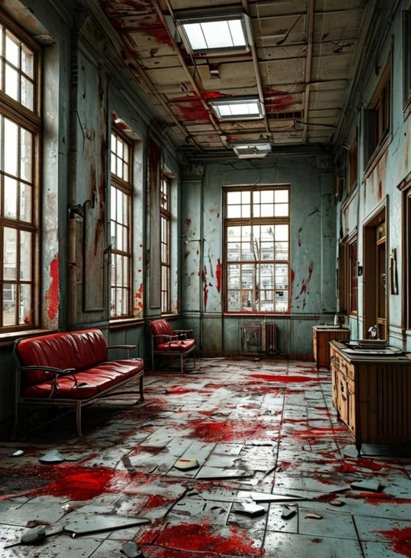Киваю. Осторожно вхожу внутрь. Сладов идет следом, оглядываясь и сжимая клинок. Кафельный пол и стены. Все забрызгано кровью. Спирает дыхание. Как же так! Стойка регистратуры разбита в щепки.