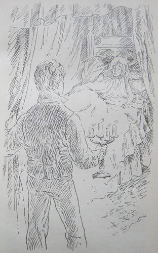 Я подошел и поставил канделябр на ночной столик.
