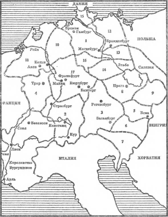 Германия около 1190 года: 1. Герцогство Саксонское. 2. Герцогство Швабское. 3. Герцогство Баварское. 4. Герцогство Верхняя Лотарингия, 5. Герцогство Австрийское. 6. Герцогство Штирийское. 7. Герцогство Каринтийское. 8. Королевство Богемское. 9. Герцогство Моравское. 10. Герцогство Вестфальское. 11. Нижняя Лотарингия и герцогство Брабантское. 12. Бранденбургская марка. 13. Лужицкая марка. 14. Мисьненская марка. 15. Графство Гольштейнское. 16. Ландграфство Тюрингское. 17. Франкония (различные графства).