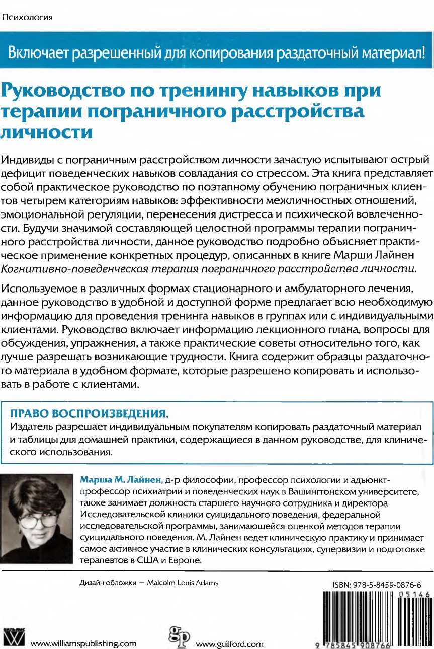 Марша М. Лайнен, д-р философии, профессор психологии и адъюнкт-профессор психиатрии и поведенческих наук в Вашингтонском университете, также занимает должность старшего научного сотрудника и директора Исследовательской клиники суицидального поведения, федеральной исследовательской программы, занимающейся оценкой методов терапии суицидального поведения. М. Лайнен ведёт клиническую практику и принимает самое активное участие в клинических консультациях, супервизии и подготовке терапевтов в США и Европе.