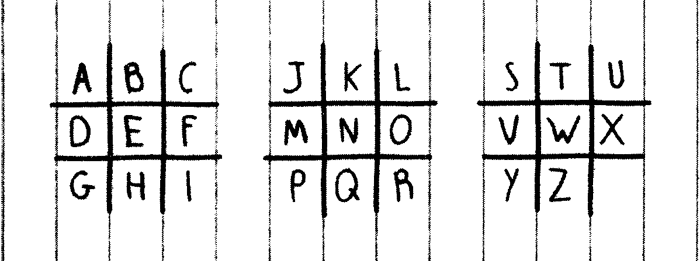 Три игровые решетки, в которых уместился весь английский алфавит – слева направо и сверху вниз. В первой были буквы от А до I, во второй – от J до R, и в последней – от S до Z. Итак, E, к примеру, располагалась в полном квадрате, B – в том, что был открыт сверху, а H – в открытом снизу. Хорошо! Друг от друга они отличались еще и тем, что в одних было по одной точке, в других – по две, а предпоследний и вовсе пустовал. Что ж, остается предположить, что квадрат с одной точкой соответствует буквам из первой решетки, тот, что с двумя точками, – из второй решетки, а предпоследний – из третьей.