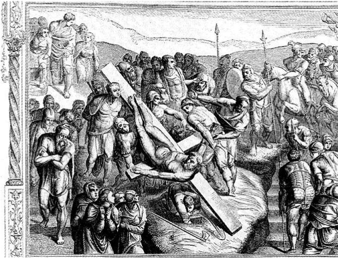 Крест мог состоять из двух, трех, иногда даже четырех перекладин и принимать самые разные формы: Т-образную, Х-образную, Y-образную. Первая разновидность – перевернутый крест – позволяла распинать человека вниз головой, так казнили бунтовщиков. Именно так распяли апостола Петра по его собственной просьбе: он посчитал себя недостойным быть распятым, как Христос. Император Нерон удовлетворил его просьбу, но другим мученикам отказал.