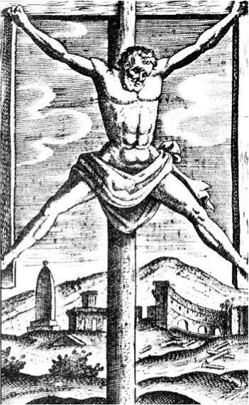 «Четырехугольное» распятие. Гравюра, опубликованная в «De Сгuсе» Юстуса Липсия. Частн. кол.